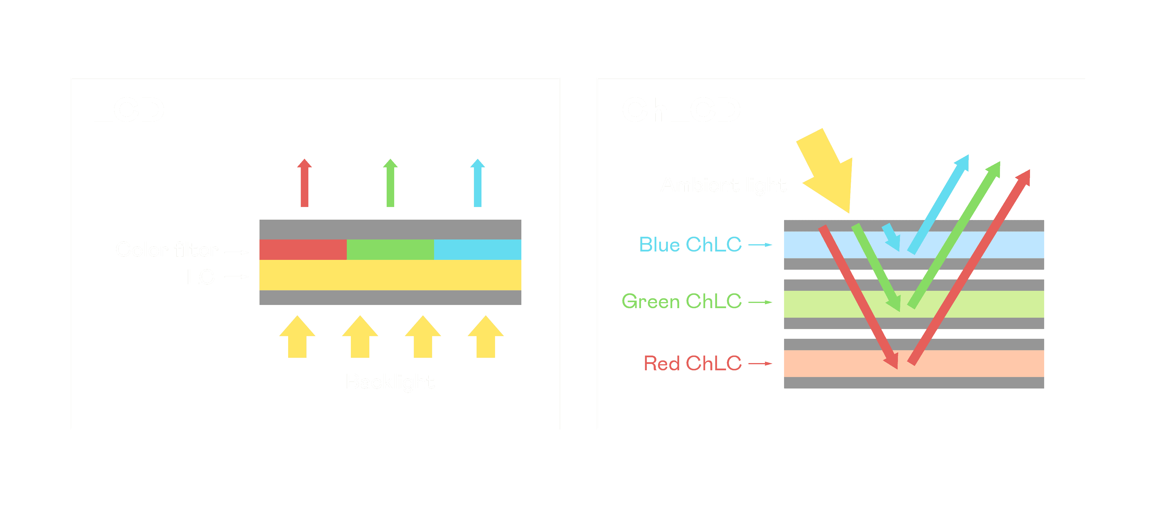 ChLCD 胆固醇液晶就如同纸张一样,,,,透过反射环境光来显示影像,,,,因此长时间观看不易造成人眼视觉疲劳,,,,可达到护眼效果。。。。当处于户外阳光下使用,,,,LCD 影像容易失真而不易观看,,,但胆固醇液晶仍可维持较佳的影像品质。。