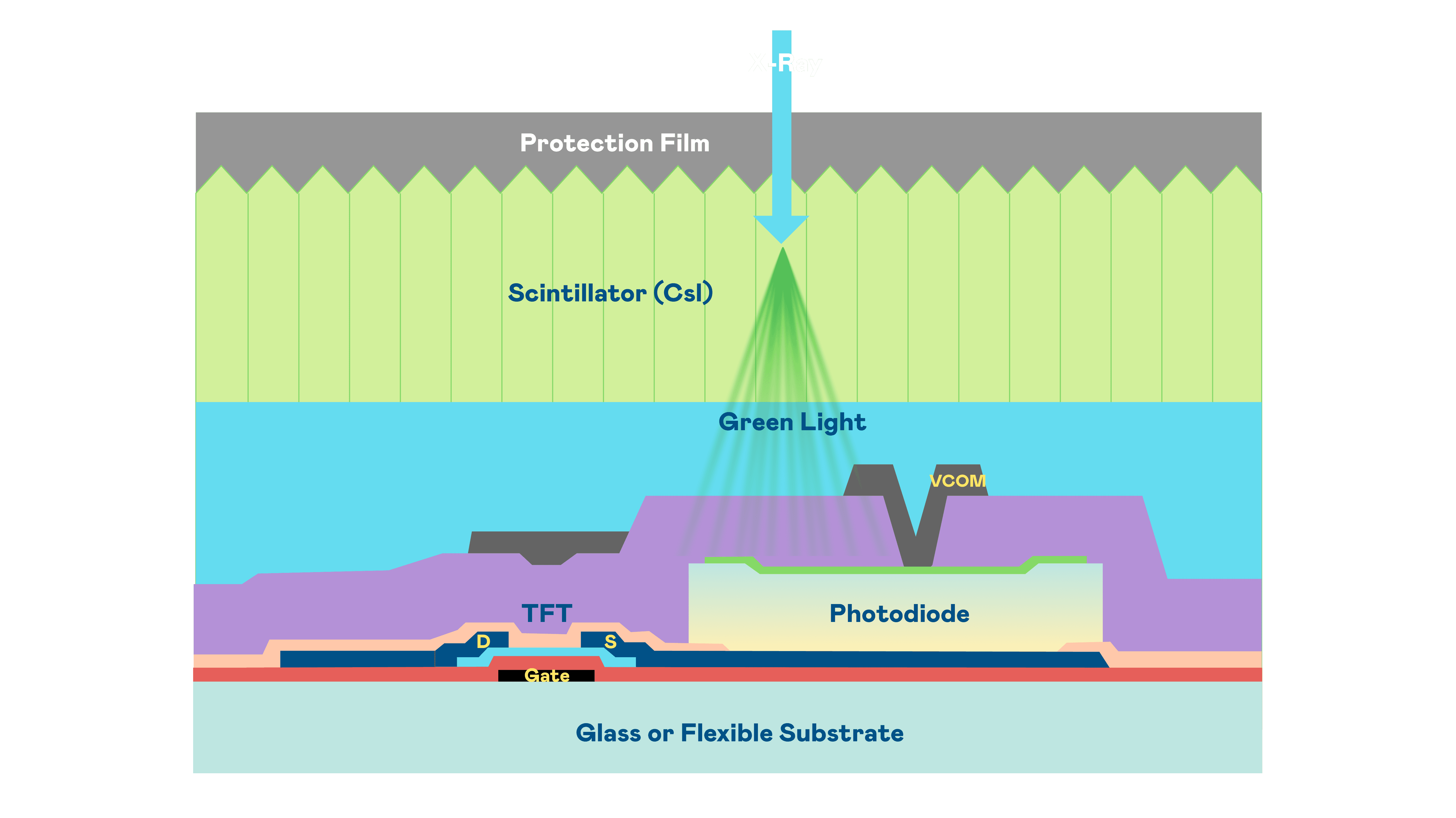 尊龙z6的X光影像感测阵列使用薄膜电晶体 (TFT) 作为每个像素的读取开关,,,,搭配光电二极体(Photodiode)的光电转换元件,,,,用以感测X光影像讯号。。。
